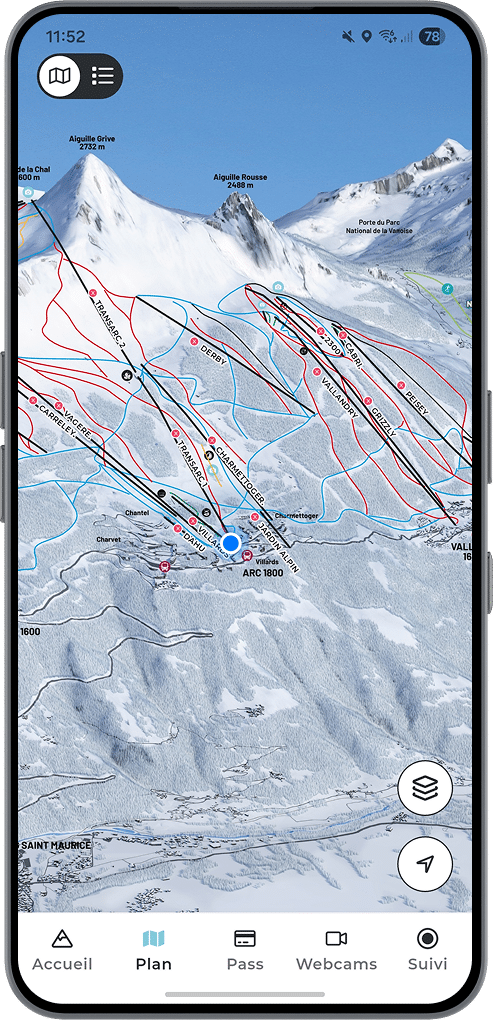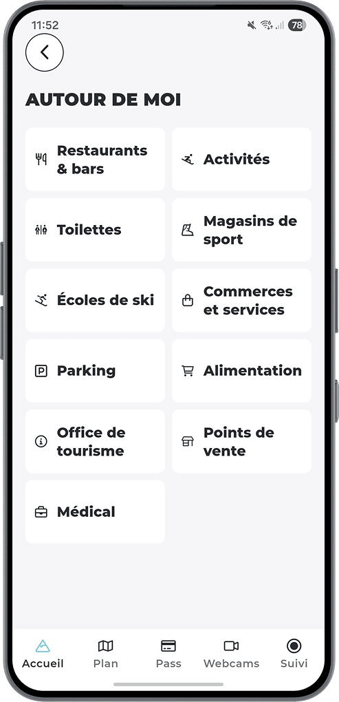 anywhere on the property and easily navigate using the interactive map. View domain information in real time, to find out about ski lift traffic, slope opening times and timetables. Looking for a restaurant or a retail outlet? Find businesses and activities around you.