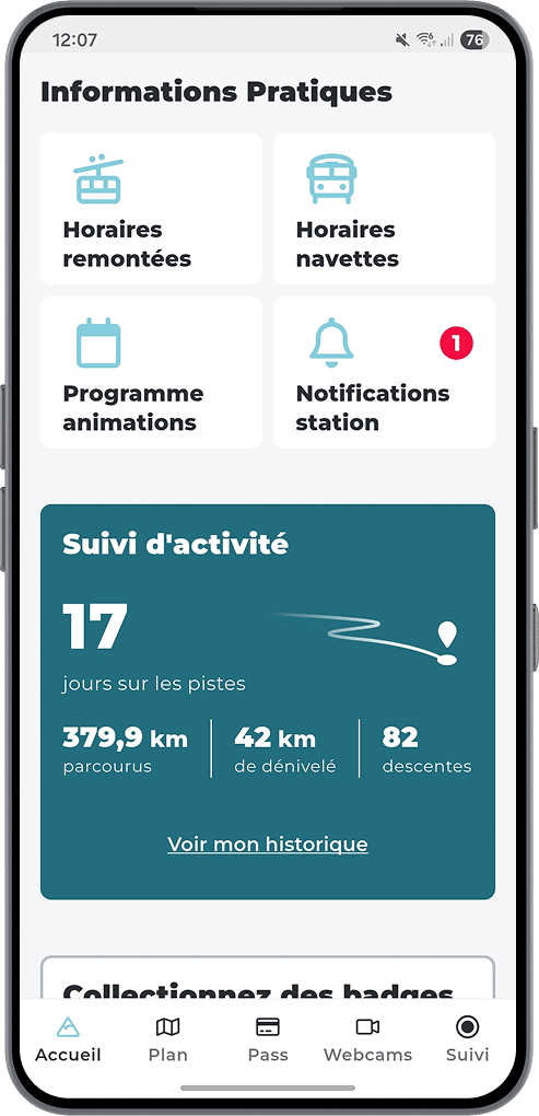 Yuge records your route, giving you your distance, elevation gain, the areas visited… Explore the domain and take on challenges! From conquering a new peak to discovering an unusual place, you unlock badges and track your progress.